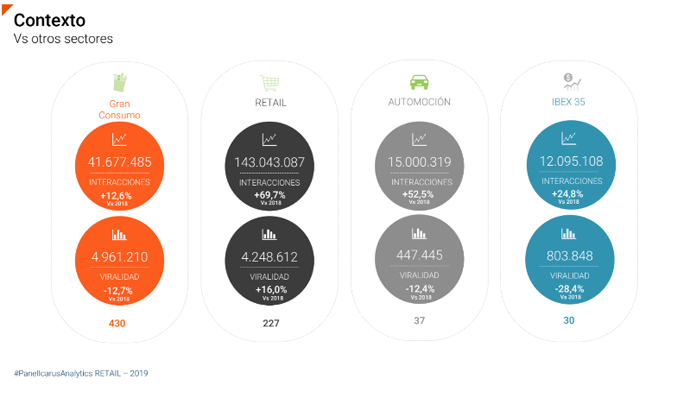 Así lo refleja el Panel Epsilon Icarus Analytics de Retail 2019, que afirma que las empresa de retail generaron más de 143 millones de interacciones en redes en 2019, suponiendo este dato un 70% más que el año anterior.