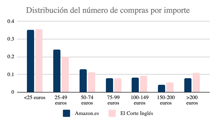 Las compras superiores a 100 euros representan un porcentaje más pequeño. En el caso de Amazon equivalen al 20% del volumen total, mientras que para El Corte Inglés suponen el