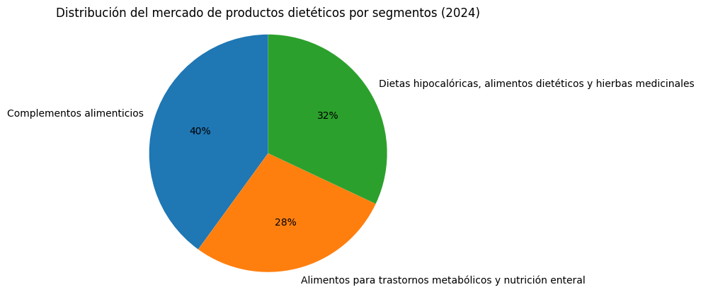 Se estima que en 2024 los complementos alimenticios concentraron el 40% del valor del mercado, situándose a continuación los alimentos para trastornos metabólicos y nutrición enteral, que en conjunto reunieron el 28%. El restante 32% se repartió entre los segmentos de dietas hipocalóricas, alimentos dietéticos y hierbas medicinales.