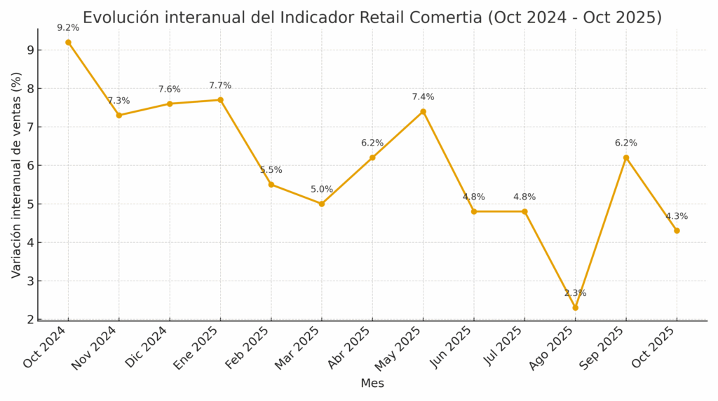 El sector llega a la campaña navideña con un tono optimista, tras cerrar octubre con un incremento medio de las ventas del 4,3% respecto al mismo mes del año anterior. No obstante, el gráfico refleja una tendencia de desaceleración en las ventas desde octubre de 2024 hasta la actualidad, con una curva descendente.