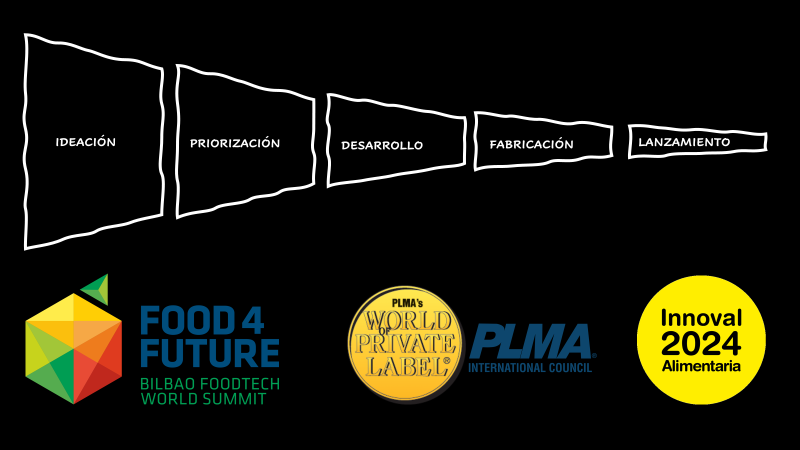 En el extremo opuesto, en el inicio del funnel, se encuentra la feria Food for Future de Bilbao, donde se identifican tendencias emergentes, necesidades sociales, nuevas tecnologías y modelos de negocio. Este evento refleja un panorama mucho más prometedor y emocionante. Aquí, el entusiasmo y el optimismo son palpables, con un bullicio constante de actividad que refleja el potencial y las promesas de revolución en el mercado alimentario.