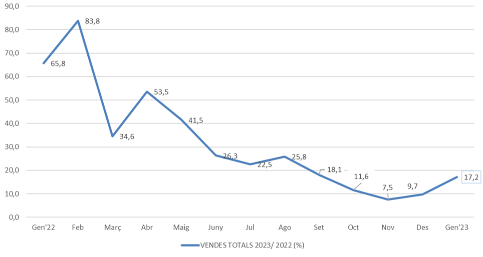 El 92,5% de las empresas de Comertia asegura haber incrementado su facturación en enero. Sólo un 7,5% afirma que habría disminuido su volumen de ventas respecto a enero de 2022 y la mayoría pronostican que su facturación también crecerá en febrero en torno al 11,5%.