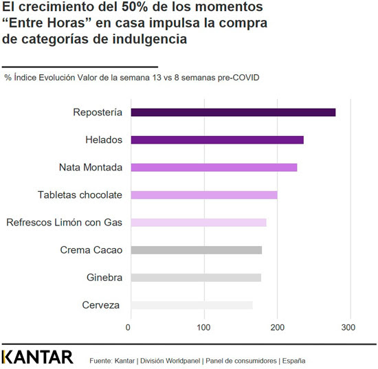 En ese sentido, las categorías relacionadas con la repostería, el chocolate o los helados han más que doblado su tamaño en la semana del 23 al 29 de marzo, un mayor crecimiento en ventas con respecto al periodo anterior a la crisis sanitaria.