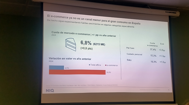 Según Ricardo Alcón, client development manager en NIQ, “el ecommerce ha sido el gran diferencial de 2024, incluso teniendo mejor comportamiento que en 2020”. Este canal ha mejorado su cuota de participación en 0,8 pp, hasta alcanzar el 6,8% del pastel del mercado de gran consumo el año pasado, lo que equivale a 6.215 millones de euros. El porcentaje de compradores de este canal es ya del 27,5%, mientras que el gasto medio por hogar ha aumentado un 17%, respecto al ejercicio pasado.
